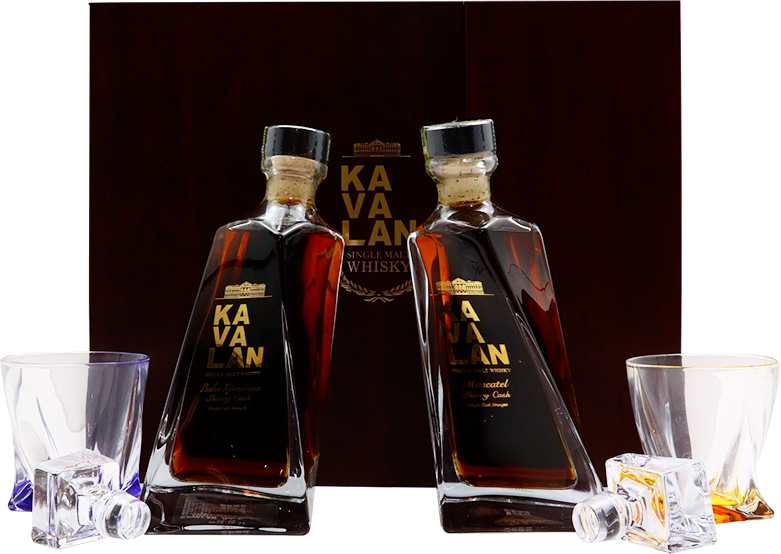 Подарочный набор Kavalan, Premium Gift Set, включает в себя 2 бутылки виски Kavalan, Moscatel Sherry Cask и Kavalan, 0.5 л. и Pedro Ximenez Sherry Cask, 0.5 л. в хрустальных бутылках с двумя бокалами в деревянной подарочной коробке.