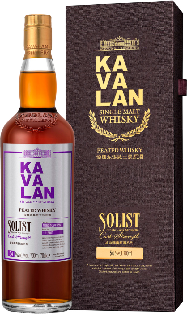 Kavalan, Solist, Peated Malt — уникальный виски бочковой крепости, сочетающий в себе элегантность, силу и изысканную тонкость. Созревание виски проходит в бочке, в которой ранее содержался торфяной виски с шотландского острова Айла. Для сохранения натурального вкуса виски не подвергается холодной фильтрации и разливается по бутылкам при бочковой крепости в 52,4% без окрашивания. Виски является прекрасным дижестивом, при необходимости в него можно добавить небольшое количество воды или лед.