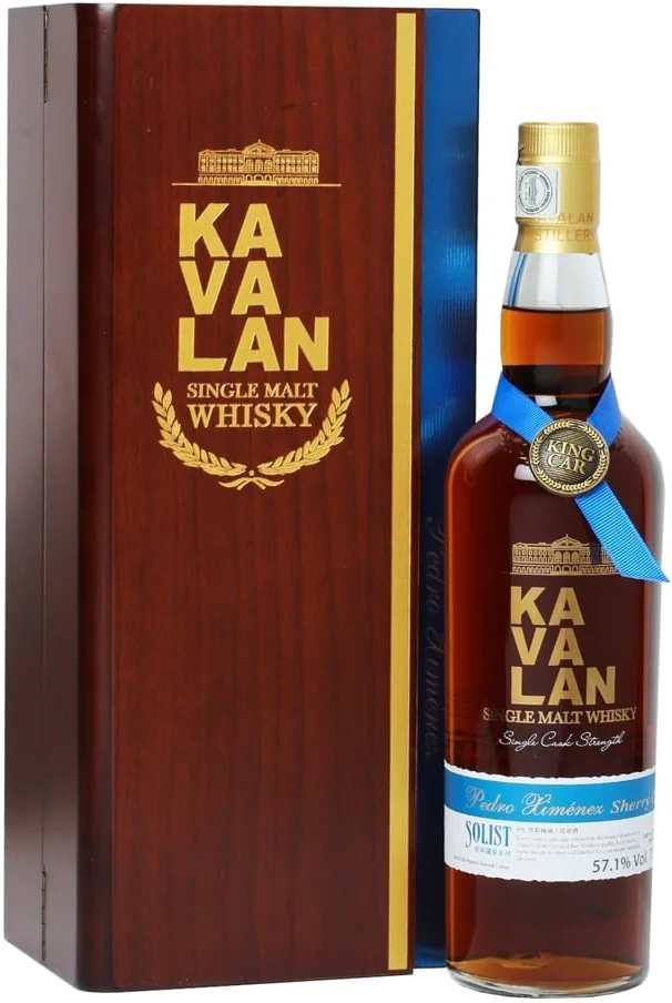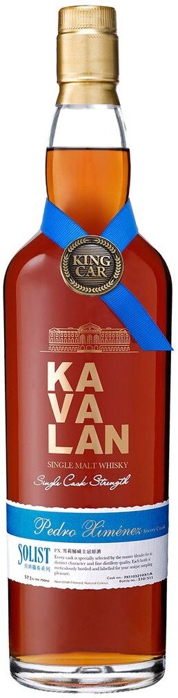 Kavalan, "Solist" Pedro Ximenez Sherry Cask — односолодовый виски, выдержанный в бочках из-под хереса Педро Хименес. Виски чарует сложным, богатым ароматом, сотканным классическими фруктовыми, ореховыми и шоколадными тонами, и полным вкусом с мягкой текстурой и невероятно долгим, элегантным послевкусием. Виски разливается по бутылкам при бочковой крепости в 57,8% без добавления воды и карамели. Виски выпускается в презентабельной деревянной коробке, что делает его прекрасным подарком для любого торжественного случая.