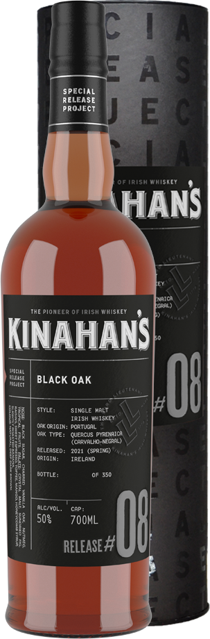 Kinahan's, Black Oak, Release #8 — эксклюзивный односолодовый ирландский виски, выпущенный в рамках лимитированного релиза "The Special Release Project". Исключительная коллекция бочек винокурни "Кинахан'с" позволяет ежегодно производить ограниченные партии виски, отличающиеся индивидуальностью и нетрадиционным вкусовым профилем. Special Release Project #8 является одним из самых необычных релизов и представляет собой односолодовый ирландский виски, выдержанный 10 лет в бочках из португальского черного дуба. Охарактеризованный как "большой, смелый и дерзкий", этот выпуск является дебютом Kinahan в виски, выдержанным в бочках из редких пород дуба. Виски созревает в бочках ручной работы из дуба Quercus Pyrenaica, произрастающего только в ограниченных регионах Португалии, и разливается без холодной фильтрации.