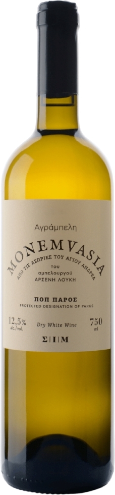 Kir-Yianni, Monemvasia, Paros — белое сухое вино из очень ароматного винограда сорта Монемвасия, название которого происходит от одноименного греческого города, находящегося на Пелопоннесе. Стеллиос Бутарис нашел небольшой участок с этим сортом винограда в Асприес, в деревне Агиос Андреас (Святого Андрея), в северной части Пароса. Владельцем участка был Арсенис Лукис, который долгое время продолжал семейную традицию выращивания винограда. Монемвасия — самый интригующий белый греческий сорт, очень чувствительный к терруару. Хотя его происхождение связано с юго-восточным побережьем Пелопоннеса, именно остров Парос считается сердцем культивации Монемвасии. У Арсениса Лукиса лозы Монемвасии старше 30 лет высажены на традиционных каменных террасах.