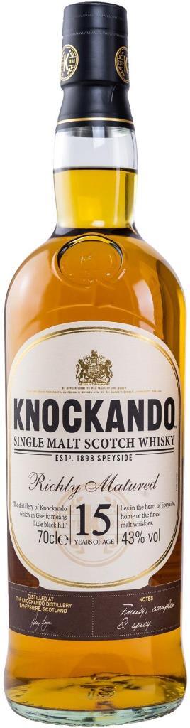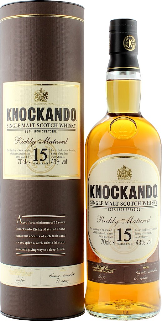 Виски Knockando Richlu Matured, 15 Years Old выдерживается в бочках из-под хереса и бурбона, благодаря чему к его славе натурального продукта, производимого на основе чистейшей родниковой воды без карамельных и иных красителей, добавились сладкие ноты имбиря, ягод и ванильно-коричные оттенки. Выпускается Knockando 15 Years Old лимитированными партиями (последняя была дистиллирована в 1995 году), когда его создатели решат, что виски созрел и достиг пика своих вкусовых качеств, о каковом моменте и свидетельствует дата розлива на этикетке.
