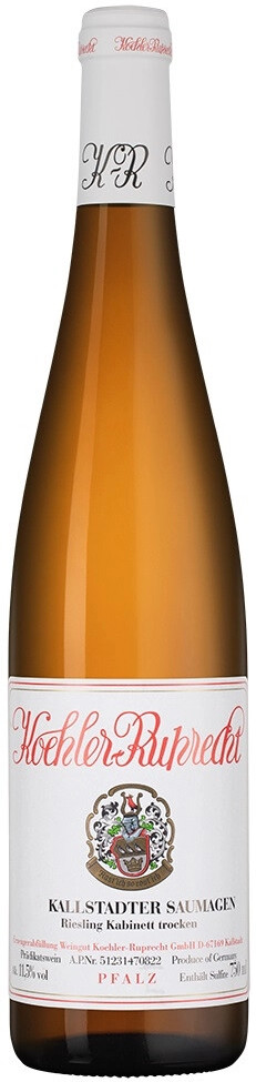 Koehler-Ruprecht, "Kallstadter Saumagen" Riesling Kabinett Trocken — белое сухое вино, изготовленное из винограда сорта Рислинг, которое полностью передает сортовые характеристики. Немецкие вина из Рислинга производили еще в XV веке, это один из старейших классических образцов немецкого виноделия. Виноград произрастает на уникальном участке "Saumagen" с 200-летними лозами. Сбор урожая проводится исключительно вручную, на винодельне плоды подвергаются спонтанной ферментации, проходящей в дубовых бочках. Выдерживается вино на протяжении 12 месяцев в бочках. На этикетке написан "код" вина, состоящий из 11 цифр. В этом коде зашифрована дата бутилирования вина (последние 4 цифры — это месяц и год розлива).