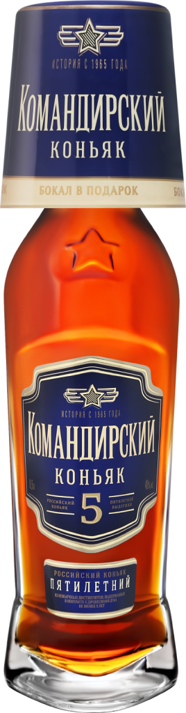 Командирский, 5 лет — отличный коньяк средней ценовой категории. В его составе — французские и российские коньячные спирты. Название "Командирский" довольно точно определяет основную группу потребителей: сильных духом, серьезных мужчин. Коньяк будет отличным подарком и подходящим напитком для того, чтобы отметить какое-нибудь знаменательное событие. Оригинальные варианты формы бутылок — треугольной или в виде фляги — выгодно отличают дизайн этого коньяка от других представителей сегмента.
