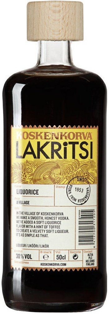 Koskenkorva, Lakritsi — финский ликер с лакричным сиропом, которая производится из отборного ячменя и местной родниковой воды. Водка проходит многократную дистилляцию, благодаря чему она приобретает мягкий, гармоничный вкус. Добавление вытяжки из корня солодки обогащает вкус лакричными нюансами. Этот напиток быстро согреет холодным зимним вечером или в промозглый осенний дождливый день — нужно просто добавить сладкую тягучую жидкость в кофе, горячий шоколад или чай.