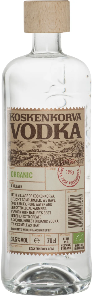 Koskenkorva Vodka, Organic — финская водка, созданная из ячменя и чистой родниковой воды. При этом ячмень выращивают местные фермеры непосредственно близ деревни Коскенкорва, не применяя гербициды или какие-либо другие химические удобрения. И даже выращенный органическим способом ячмень в последствии хранится отдельно от других злаков. Ферментация и дистилляция зерна также проходит отдельно от другого сырья. Вторая составляющая — чистая родниковая вода, соответствующая всем требованиям качества и не подвергавшаяся химической или механической обработке. Благодаря такой уникальной рецептуре водка приобретает особенный, мягкий вкус.