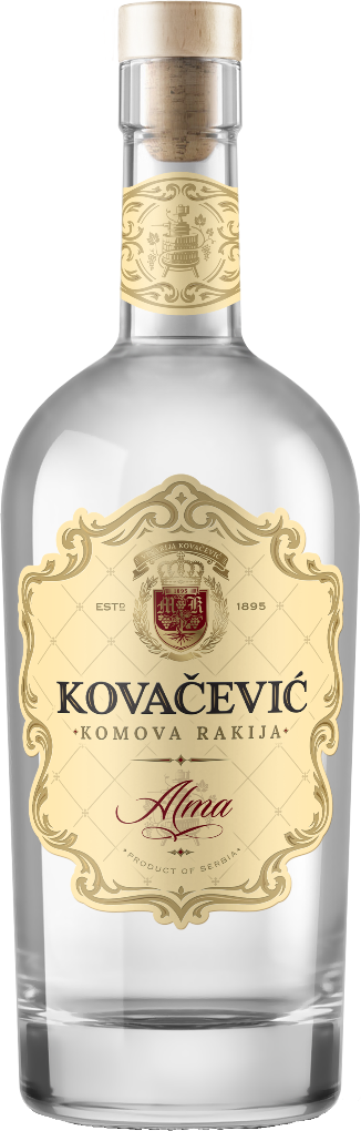 Kovacevic, Rakija Alma - виноградный дистиллят который производится по старому методу приготовления тостов в традиционных медных казанах путем перегонки выжимки винограда самого высокого качества для производства вина. Бренди Альма производится по образцу итальянской граппы.