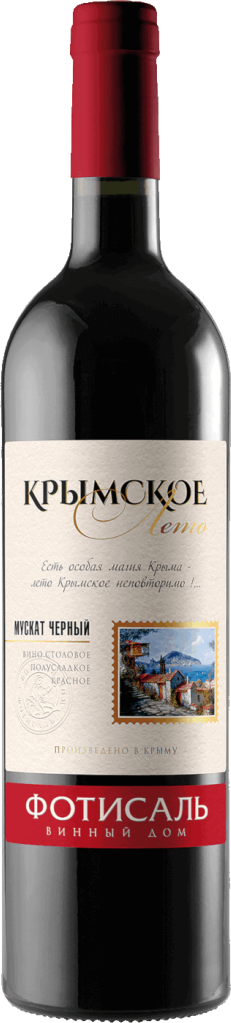 Красное полусладкое вино Крымское Лето, Мускат Черный, изготовленное из выращенного в Крыму виноградов мускатных сортов, обладает ярким мускатным ароматом и гармоничным, мягким вкусом с приятной сладостью. Вино входит в линейку "Сокровища Крыма", которая прославляет винодельческие традиции Крыма, заложенные в XIX веке и ставшие базой для создания легендарных вин, явившихся основой мировой славы винодельческой отрасли России.