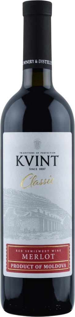 Kvint, Classic, Merlot Semi-Sweet — красное столовое вино, покоряющее интенсивно-рубиновым цветом и насыщенным ягодным ароматом. Оно изготовлено из винограда, выращенного в Молдавии, и обладает характерной терпкостью. Его бархатная текстура и свежесть уравновешивают впечатление. Сервировать вино "Квинт" Классик, Мерло рекомендуется к красному мясу и сырным закускам.