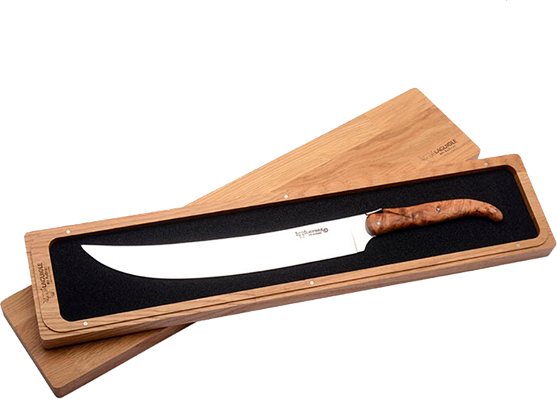 Уникальная французская сабля Laguiole En Aubrac Sabre Champagne Genevrier для сабаража является эксклюзивным винным аксессуаром, получившим положительную критику от известных сомелье. С ее помощью можно красиво открыть бутылку шампанского, просто сбив верхнюю часть горлышка. После этого алкоголь можно эффектно разлить по бокалам.