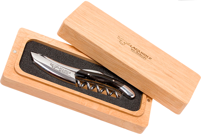 Штопор Laguiole En Aubrac Sommelier эбеновое дерево имеет удобную складную конструкцию. Его можно свободно носить в кармане или сумке, брать с собой на отдых, выездные мероприятия, природу. С помощью специального небольшого ножа с горлышка бутылки можно будет легко срезать фольгу, а острая спираль на 5 витков облегчает извлечение пробки. На лицевой стороне изделия размещен фирменный логотип компании Laguiole, которая существует с 1828 года.