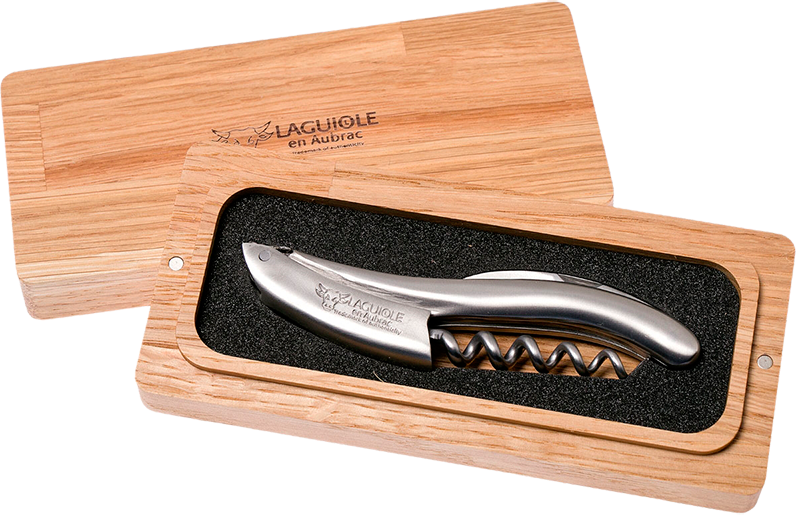Штопор Laguiole En Aubrac Sommelier Матовая Сталь гармонично сочетает в себе стильный дизайн и высокую функциональность. В сложенном виде все его острые части надежно укрыты, поэтому пораниться будет невозможно. Поставляется штопор в солидной деревянной коробочке, поэтому его можно использовать в качестве презента. На него дается пожизненная гарантия.