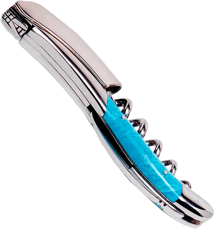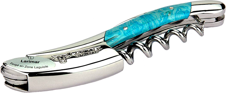 Ручка штопора Лаголь Эн Абрак Сомелье Ларимар изготовлена из минерала. Она порадует владельца насыщенным цветом, красивым рисунком и превосходной эргономикой. Ручка тщательно отшлифована, поэтому принесет приятные тактильные ощущения. Спираль и опорный рычаг штопора выполнены из прочной и износостойкой стали. Дополнительно этот винный аксессуар имеет специальный нож для срезания фольги с бутылки. Конструкция складная и занимает минимум места.