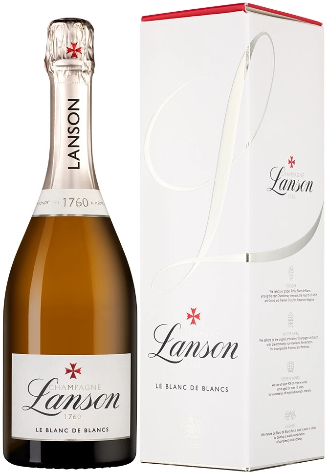 Lanson, Le Blanc de Blancs Brut, Champagne — роскошное шампанское от Дома Лансон, созданное из винограда сорта Шардоне, выращенного в регионе Шампань на самых престижных виноградниках в Авизе, Краман, Ле Мениль-сюр-Огер и других. Сбор урожая проводится исключительно вручную, на винодельне плоды подвергаются традиционной ферментации в стальных резервуарах со строгим температурным контролем. Вторичная ферментация проводится традиционным методом в бутылке и длится 5 лет.