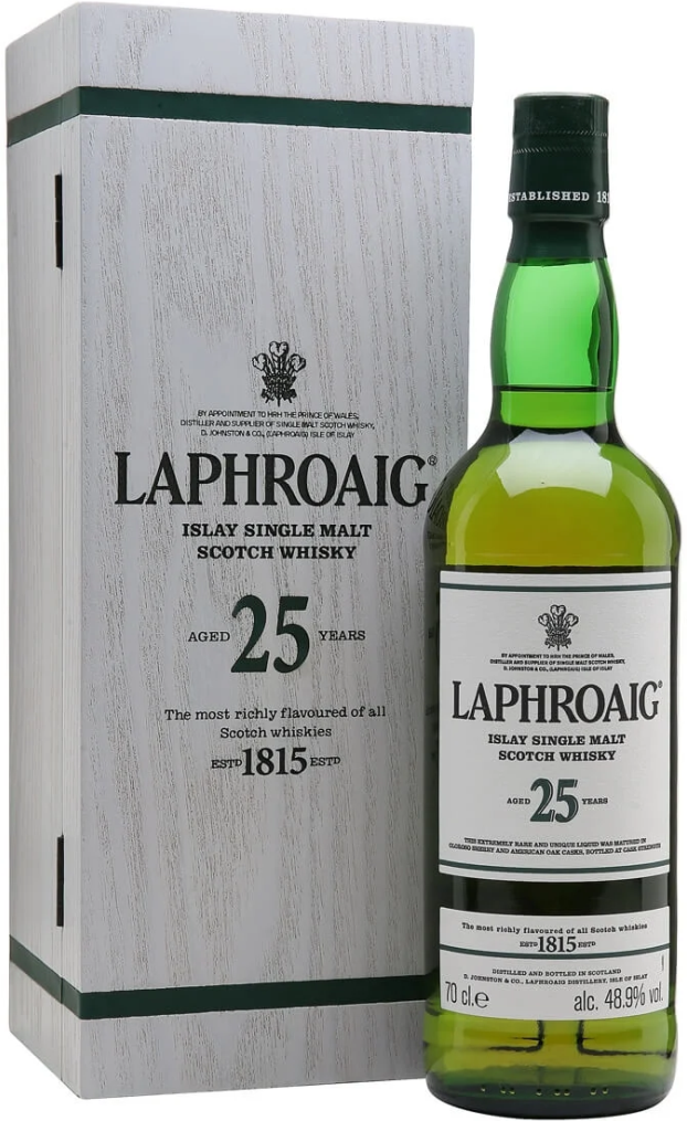 Laphroaig 25 Years Old (48,9%) — односолодовый виски с характерными дымно-торфяными нотами, оттенками спелых фруктов, нюансами морской воды и вереска с Айлы. Виски выдерживался в течение 25 лет в бочках из-под американского бурбона, оттенки которого хорошо заметны в аромате виски.