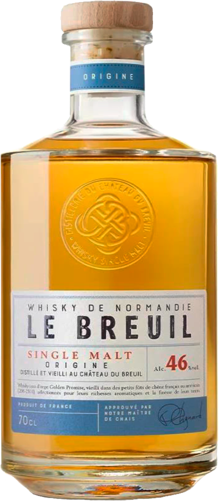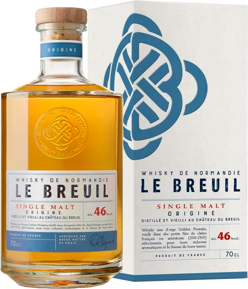 Le Breuil, Single Malt Origine — изысканный, элегантный односолодовый виски, прошедший двойную дистилляцию и выдержанный в бочках из французского дуба и бочках из американского дуба из-под бурбона объемом в 200– 265 литров. Он обладает фруктовым характером, хорошей солодовой базой и долгим, мягким послевкусием.