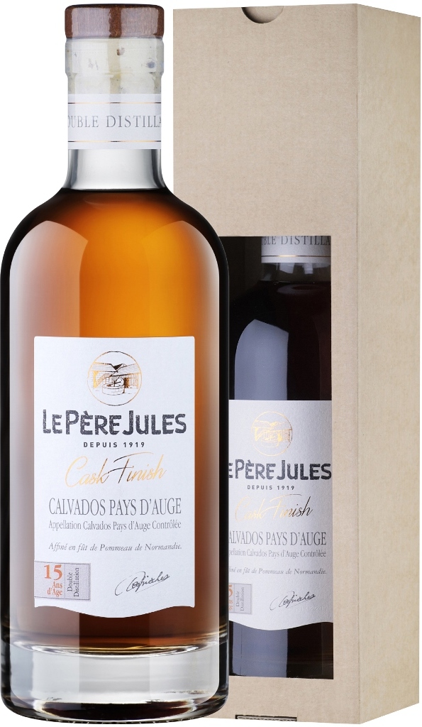 Le Pere Jules, 15 Ans Cask Finish, Calvados Pays d'Auge — изысканный кальвадос, за которым стоит дом с богатой историей и престижной репутацией. Производство осуществляется верными традициям предков методами с использованием 60 различных сортов яблок, чтобы создавать исключительные продукты, воплощающие дух и богатое наследие Le Pere Jules. Яблоки собираются и сортируются вручную, это гарантирует наилучшее качество. Ферментация может длиться до 3-х месяцев в зависимости от температуры брожения. Полученный сидр хранится на протяжении года, а затем перегоняется дважды в традиционном кубе шарантского типа, отапливаемом дровами. Без каких-либо добавок и окрашивания карамелью кальвадос выдерживается 14 лет в бочках из-под Поммо де Норманди и сидра объемом от 225 до 8000 литров, а затем еще не менее года дозревает в 400-литровых бочках из-под Поммо. Кадьвадос выпускается в презентабельной коробке, что делает его отличным подарком для любого торжественного случая.
