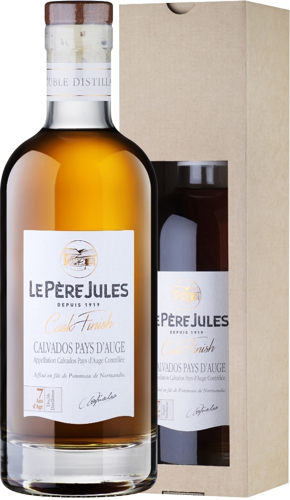 Le Pere Jules, 7 Ans Cask Finish, Calvados Pays d'Auge — изысканный кальвадос, за которым стоит дом с богатой историей и престижной репутацией. Производство осуществляется верными традициям предков методами с использованием 60 различных сортов яблок, чтобы создавать исключительные продукты, воплощающие дух и богатое наследие Le Pere Jules. Яблоки собираются и сортируются вручную, это гарантирует наилучшее качество. Ферментация может длиться до 3-х месяцев в зависимости от температуры брожения. Полученный сидр хранится на протяжении года, а затем перегоняется дважды в традиционном кубе шарантского типа, отапливаемом дровами. Без каких-либо добавок и окрашивания карамелью кальвадос выдерживается 6 лет в бочках из-под Поммо де Норманди и сидра объемом от 225 до 8000 литров, а затем еще не менее года дозревает в 400-литровых бочках из-под Поммо. Кадьвадос выпускается в презентабельной коробке, что делает его отличным подарком для любого торжественного случая.