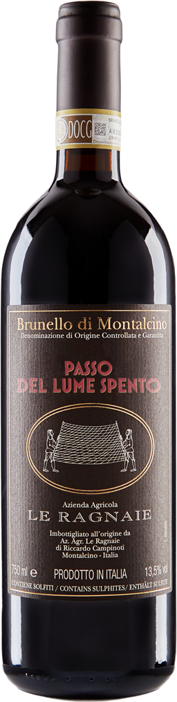 Le Ragnaie, "Passo del Lume Spento", Brunello di Montalcino — органическое красное сухое вино из винограда сорта Санджовезе, который собирается с самого высокогорного виноградника Монтальчино. "Passo del Lume Spento", название которого переводится как "Перевал Погасшего Фонаря" расположен на песчаном плато на высоте 621 метра над уровнем моря. Урожай собирается по достижении ягодами оптимальной спелости. На винодельне виноград тщательно сортируется на сортировочном столе, отбираются только лучшие грозди. Сусло ферментируется и мацерируется в бетонных чанах с регулярной ручной перекачкой сусла на протяжении от 45 до 90 дней. Затем сок отделяется от мезги путем мягкого прессования и помещается в большие бочки из славонского дуба объемом 25 гектолитров, в которых вино выдерживается в течение 36 месяцев. Вино разливается без фильтрации и оклейки, с минимальным добавлением серы.