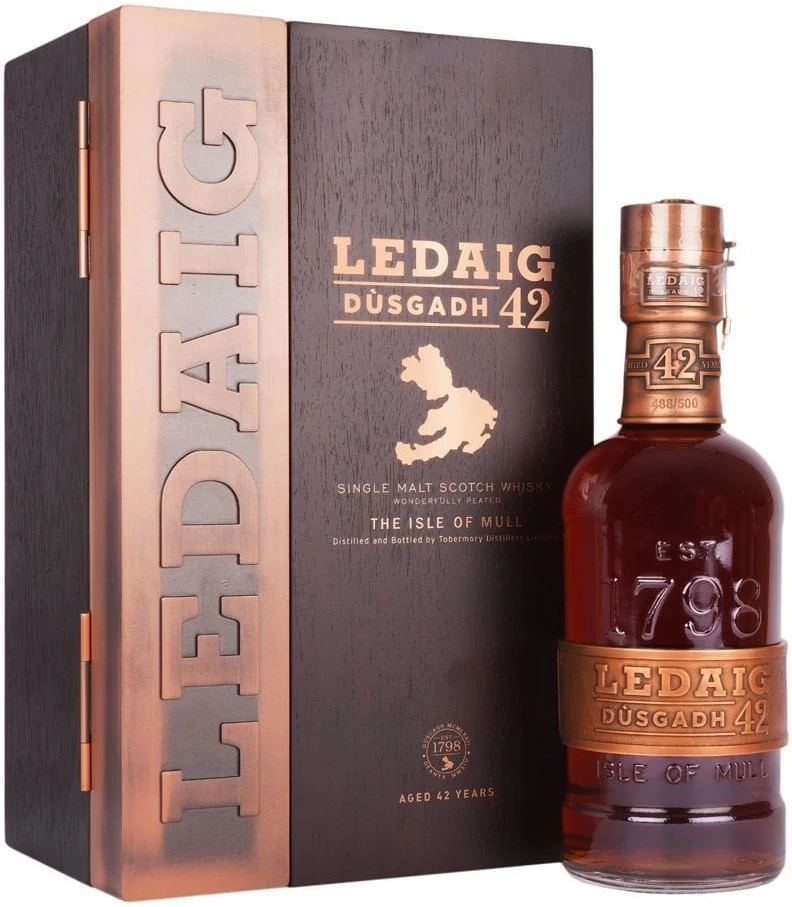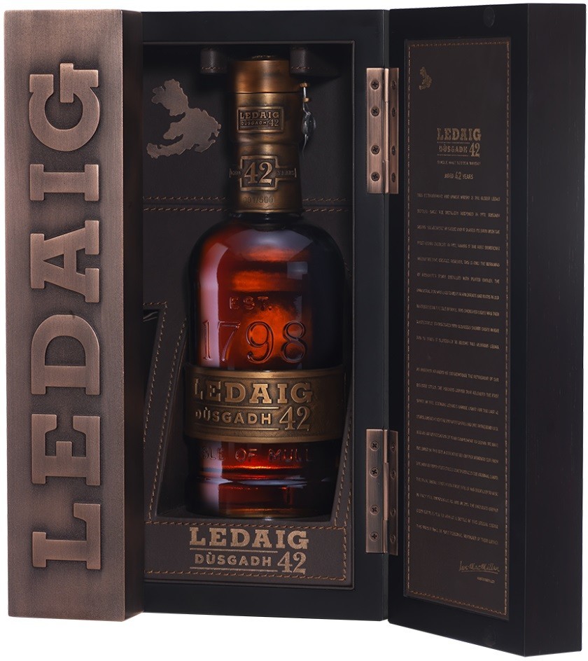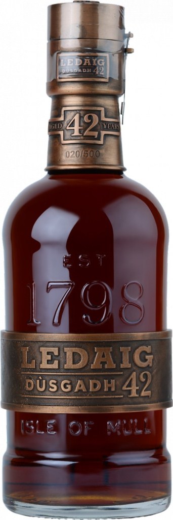 Ledaig, Dusgadh, Aged 42 Years — редкий, уникальный шотландский виски, выпущенный очень ограниченным тиражом в 500 бутылок, каждая из которых пронумерована. В переводе с гаэльского языка "Dusgadh" — "Пробуждение". 1972 год можно считать вторым годом рождения винодельни, ведь именно в этом году, после долгого простоя, на заводе были установлены новые перегонные медные кубы и началась непрерывная работа. В 2014 году эти кубы были с почетом отправлены "на пенсию", а медные фрагменты стали неотъемлемой частью дизайна бутылки и коробки.