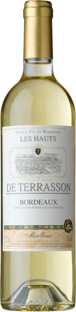 Les Hauts de Terrasson, Blanc Moelleux, Bordeaux — элегантное белое полусладкое вино, созданное из винограда сортов Семильон и Совиньон Блан. Вино названо в честь деревни Террассон, где расположены виноградники. Ягоды произрастают на склонах с глинисто-известняковыми почвами и гравийным плато Антр-де-Мер. Возраст виноградных лоз составляет 20 лет. Сбор урожая проводится в момент полной зрелости ягод, на винодельне плоды подвергаются винификации, во время которой часть сахаров превращается в спирт, а другая часть остается в вине (остаточный сахар). Выдерживается вино в стальных емкостях.