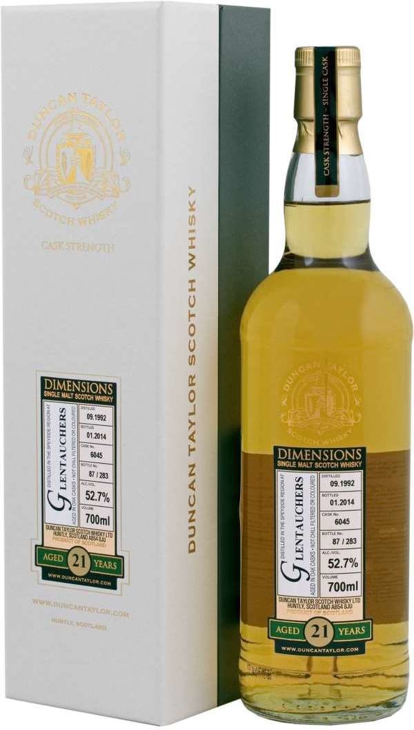 Glentauchers, 21 Years Old, "Dimensions", — редкий благородный виски, выпущенный известнейшим шотландским производителем Duncan Taylor & Co. Высочайшее качество его продукции неоднократно завоевывало множественные престижные награды на международных конкурсах, включая популярнейший конкурс в мире алкогольных напитков "International Wine & Spirit Competitions". Для производства этого уникального виски были отобраны только отменные спирты, без добавления красителей. Чтобы подчеркнуть аутентичность своей продукции и удовлетворить требовательные запросы как знатоков, так и экспертов, Данкан Тейлор маркирует каждую бутылку датой дистилляции и розлива, указывая номер конкретной бочки, а также порядковый номер бутылки. С гордостью можно констатировать подлинность каждого шедевра, рожденного в стенах винодельни, а также уверенно заявить о гарантированной принадлежности к высочайшему статусу старых раритетных напитков!