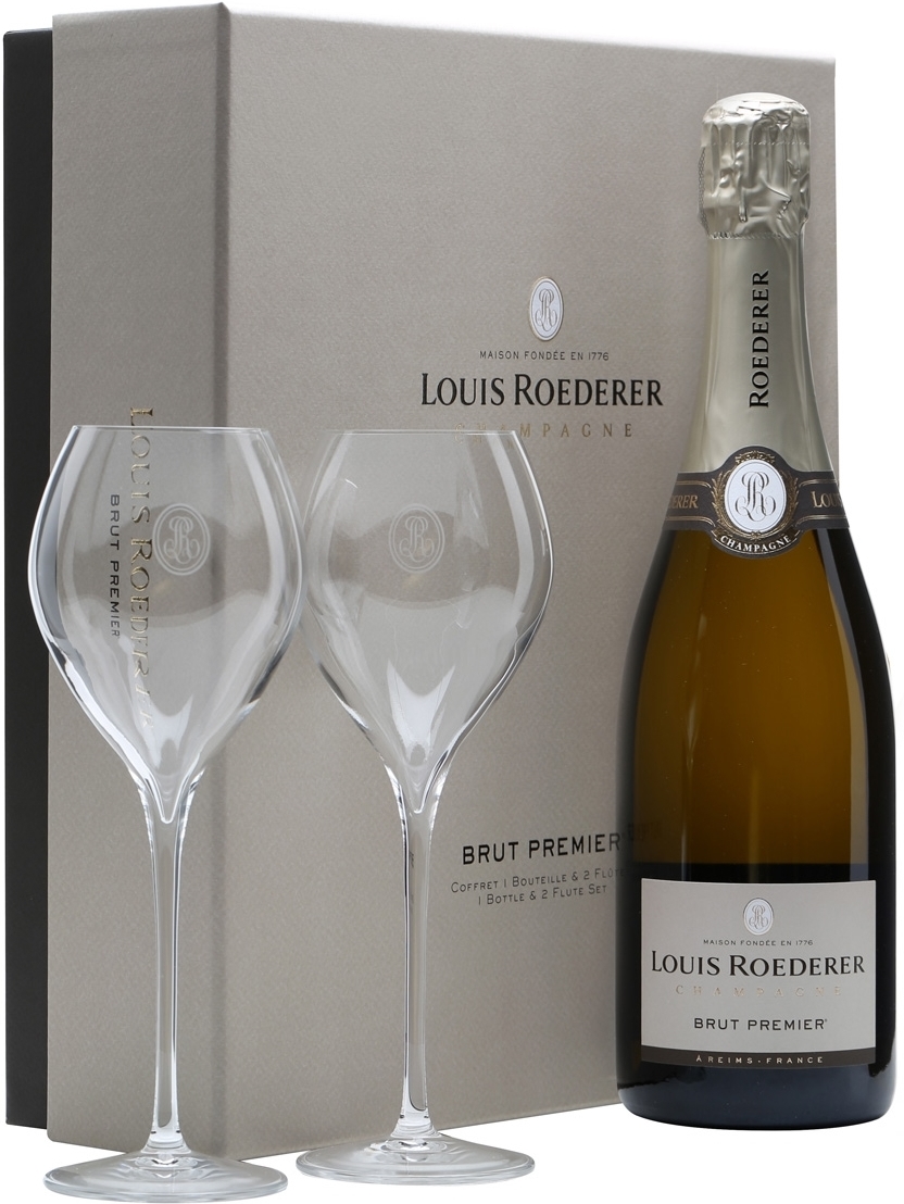 Бутылка великолепного Брют Премьер представлена в элегантной картонной коробке, украшенной роскошным золотистым логотипом Луи Родерера, в сопровождении двух изысканных бокалов, что делает шампанское прекрасным подарком.