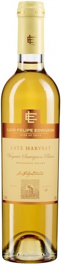 Luis Felipe Edwards, Late Harvest, Viognier-Sauvignon Blanc — великолепное сладкое вино, которое производится из тщательно отобранных ягод двух сортов винограда, выращенного в долине Кольчагуа. Виноград снимается с лоз вручную в самом конце сезона сбора урожая (late harvest — поздний урожай), когда он полностью созрел, а уровень сахара достиг своего пика. Часть винограда к этому времени поражается благородным грибком "ботритис", в связи с чем ягоды обладают повышенной концентрацией сахара и развитым фруктовым вкусом. Выдержка вина в течение 4-х месяцев в бочках из французского дуба сделала вкус вина еще более сложным и насыщенным. В купаже вина отмечается изысканная гармония между насыщенными фруктовыми нотами Вионье, цитрусовыми ароматами Совиньон Блан и приглушенной медовой сладостью "ботритиса".