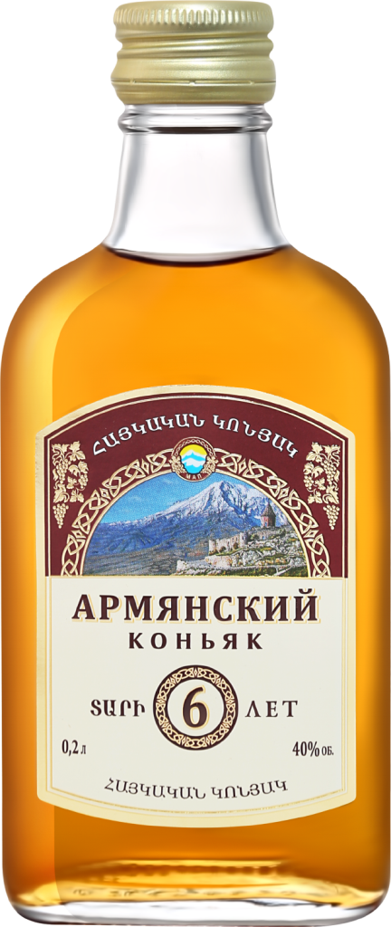 Элегантный коньяк Армянский Коньяк 6-летний изготовлен по традиционному армянскому рецепту и обладает характерным, классическим вкусом коньяков Араратской долины. Для изготовления напитка используется виноград сортов Кангун и Ркацители, который мягко прессуется, ферментируется и дистиллируется. Выдержка коньяка проводится в дубовых бочках и длится 6 лет. Коньяк рекомендуется употреблять в чистом виде, а также сочетать с мясными деликатесами, рыбой, сырами, десертами и спелыми абрикосами, добавлять в коктейли или кофе.