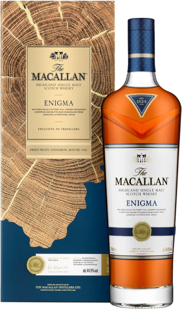 Macallan, "Enigma" — богатый и интенсивный односолодовый виски, сочетающий в себе зрелость дуба с нотками корицы, ванили и сухофруктов, из коллекции Travel Retail Quest Collection, запущенной в конце 2017 года. Каждый односолодовый виски в этой линейке — это исследование вкуса, от яркого и свежего до насыщенного и концентрированного, олицетворяющее суть Macallan. "Enigma" представляет собой вершину коллекции Quest. Выдержанный в исключительных дубовых бочках из-под хереса одной бондарной фабрики в Херес-де-ла-Фронтера, Испания, этот виски не оставит равнодушным почитателей Macallan. Особая древесина формирует уникальный характер высокогорного виски. Это выражение непреходящего желания Macallan выйти за рамки обычного, искать необычное и создавать несравненные односолодовые виски. Изображение разреза дуба на этикетке изображает "сердце" Макаллана, еще раз акцентируя внимание на новых путешествиях и неизведанных мирах. Односолодовый виски "Enigma", идеально передающий богатство хересных бочек, характеризуется полным, продолжительным вкусом с тонами сухофруктов, насыщенной корицы и интенсивно мягкими древесными специями, усиливая предвкушение в бесконечном стремлении к совершенству.