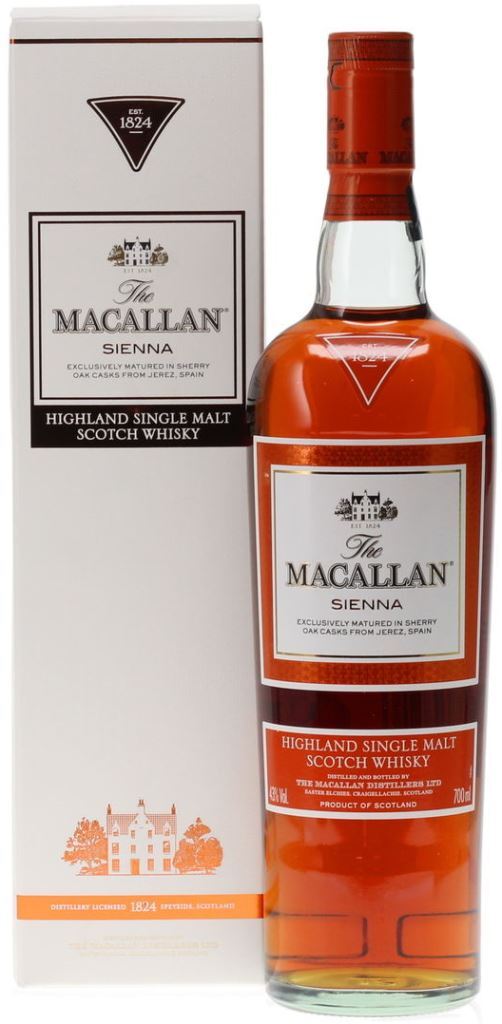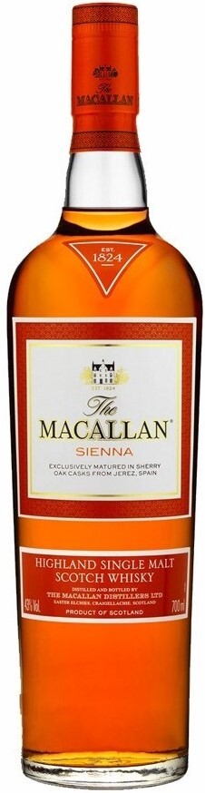 Односолодовый виски Macallan Sienna является одним из четырех новых сортов 1824 Series, выпущенных без указания возраста. Этот скотч выдерживается в испанских дубовых бочках из-под хереса, чему и обязан своим сбалансированным нежным вкусом со сладким ароматом сухофруктов, характерной сухостью и легкими нотками специй, а также удивительным цветом, в честь которого он назван.