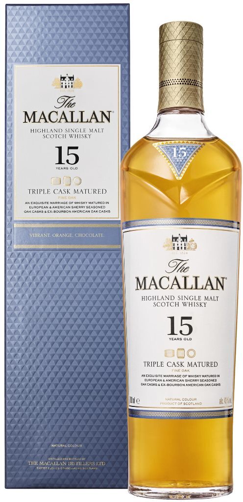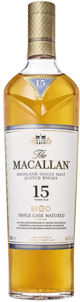 Виски Macallan, "Triple Cask Matured" 15 Years Old является частью линейки "Triple Cask Matured". Виски производится с использованием трех видов бочек: европейские бочки из-под хереса, американские бочки из-под хереса и американские бочки из-под бурбона. Благодаря такой сложной выдержке виски приобретает гладкий, деликатный вкус с оттенками апельсина и шоколада. После 15-летней выдержки он разливается в бутылки при крепости 43%.