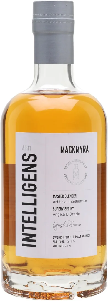 Mackmyra, Intelligents — шведский односолодовый ячменный виски, выдержанный исключительно в бочках из-под бурбона, из американского и шведского дуба. Емкость бочек - 200, 100 и 30 литров. Для изготовления виски используется ячмень, выращенный в Швеции. Мастер купажа – искусственный интеллект под наблюдением Анжелы д’Орацио.