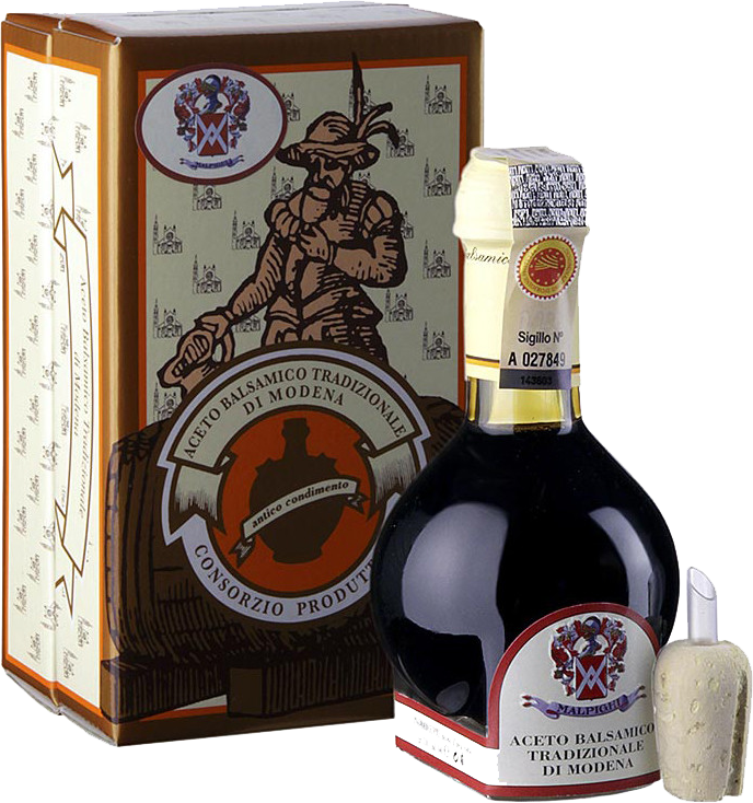 С 1850 года компания Ачетайя Мальпиги на протяжении пяти поколений следует традициям изготовления бальзамического уксуса. Собственные виноградники и старинные секреты производства позволяют в процессе перелива и подкрепления обеспечить уксус особым блеском и многогранным ароматом. Уксус "Affinato" Aceto Balsamico Tradizionale di Modena отличается густой консистенцией, что по праву делает его настоящим "бальзамом". Выдержка этого уксуса длится 12 лет и проходит в бочках из различных пород древесины, после чего он бутилируется во флаконы по 100 мл. Экспорт этого уксуса производится по всему миру.