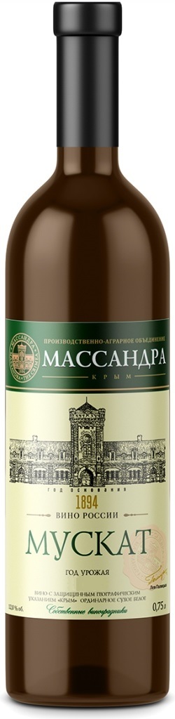 Сухое белое столовое вино Массандра, Мускат изготавливается из мускатных сортов винограда, которые выращиваются на собственных виноградниках объединения "Массандра". Вино производится классическим для белых вин методом. Сусло подвергается традиционной винификации при контролируемой температуре в стальных резервуарах. Сухой Мускат имеет в своем вкусе и аромате характерные мускатные тона: меда, розы, дыни и спелых фруктов. Вино отлично в качестве аперитива, в сочетании с закусками и салатами, блюдами из рыбы и белого мяса, морепродуктами и сырами.