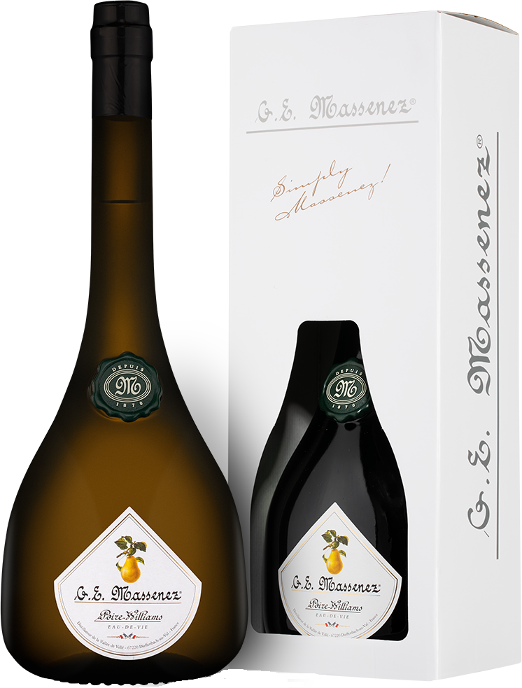 Massenez, Eau de vie, Origine, Poire Williams — фруктовый дистиллят компании Массенез, созданный путем двойной дистилляции груши сорта Вильямс. Фрукты собираются вручную и тщательно сортируются, благодаря таком отбору напиток получает исключительный натуральный аромат, ведь неслучайно "Eau de vie" переводится как "вода жизни". Название линейки "Origine" и необычная форма бутылки отсылают к 1870 году, когда компания Massenez создала свой первый бренди.