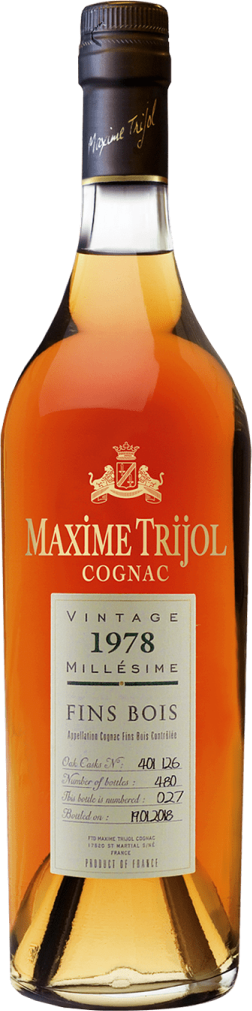 Для создания коньяка "Maxime Trijol" Fins Bois AOC, 1978 производитель использовал высококачественные коньячные спирты из урожая винограда 1978, собранного в регионе Фэн Буа. Коньяк подвергли двойной дистилляции в шарантских перегонных кубах. Выдержка дистиллятов длилась не менее 38 лет в бочках из французского дуба. Коньяк бутилировали 19 января 2018 года, а его релиз насчитывает 480 бутылок.