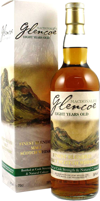MacDonald's Glencoe, 8 Years Old — насыщенный, богатый шотландский виски, который демонстрирует элегантную гармонию аромата и вкуса. Напиток назван в честь Джона Макдональда по прозвищу Длинный Джон, основавшего ликероводочный завод у самого подножия горы Ben Nevis. В 1960-х годах винокурня уже принадлежала другим хозяевам, но Макдональды, продолжая тесно сотрудничать с ними, предложили внести в ассортимент новый крепкий и пряный напиток. Рецепт его приготовления принадлежал потомку Джона Макдональда — Рори и представлял собой купаж, составленный из 8-летних односолодовых виски бочковой крепости. Несмотря на достаточно высокую крепость напитка, он имеет приятный вкус и очень легко пьется. В 2002 году виски был награжден серебряной медалью от Monde Selection — международного института качества, находящегося в Брюсселе.