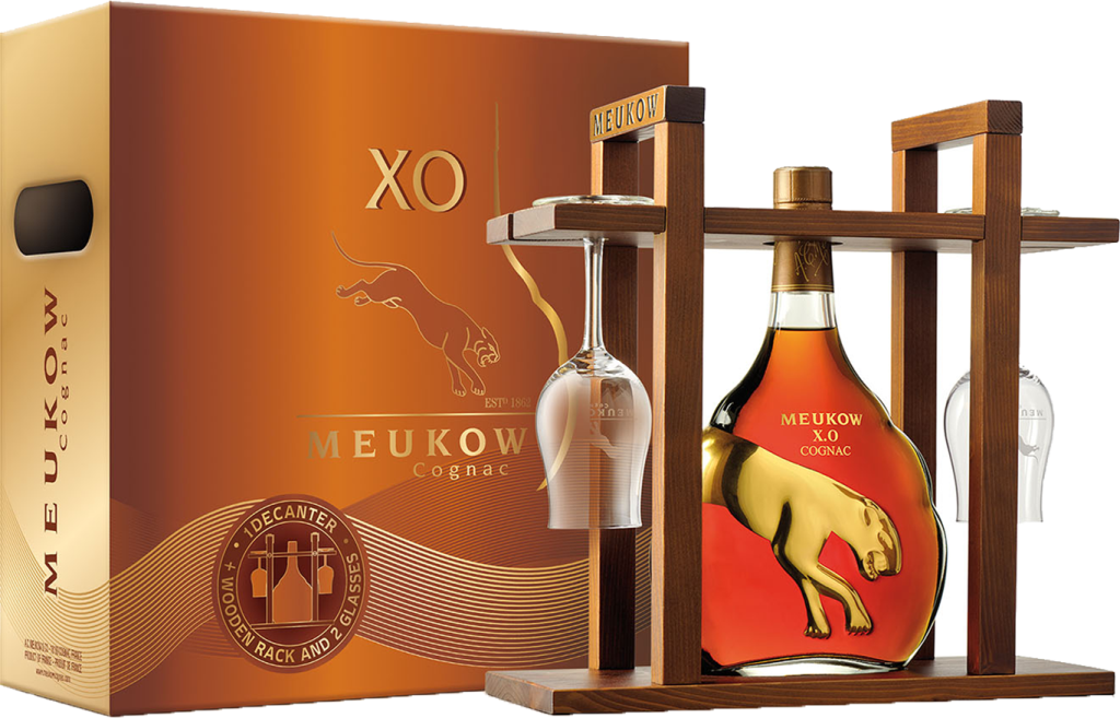 Коньяк Meukow XO создается из замечательных спиртов, произведенных в лучших областях региона Коньяк : Гранд и Пти Шампань, выдерживается в дубовых бочках 20-25 лет. Разливается в элегантные бутылки с изображением пантеры, которая декорирована 24-каратным золотом.
