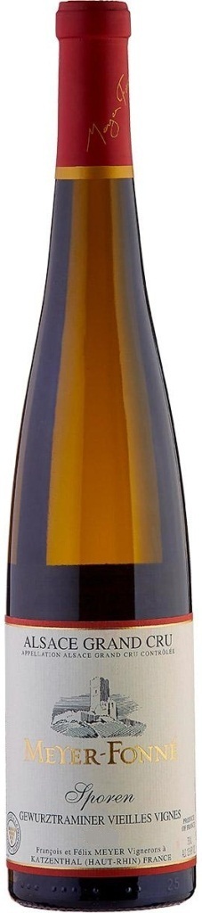 Gewurztraminer Sporen Grand Cru Vieilles Vignes — очень выразительное и прекрасно сбалансированное белое полусладкое вино из винограда Гевюрцтраминер, выращенного на старых лозах виноградника Спорен Гран Крю. Залогом прекрасных органолептических свойств вина является уникальный терруар региона: мягкий континентальный климат, мергелевые и глинистые почвы скалистых холмов, а также южная и восточная экспозиция виноградников, обеспечивающая лозы достаточным количеством солнечного тепла и света. Сбор урожая виноделы хозяйства Мейер-Фонне осуществляют вручную, ягоды тщательно сортируют и ферментируют в старых французских дубовых бочках. Затем вино выдерживается на осадке в этих же бочках, благодаря чему приобретает мощный, насыщенный характер и способность к длительному хранению.