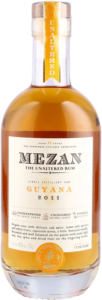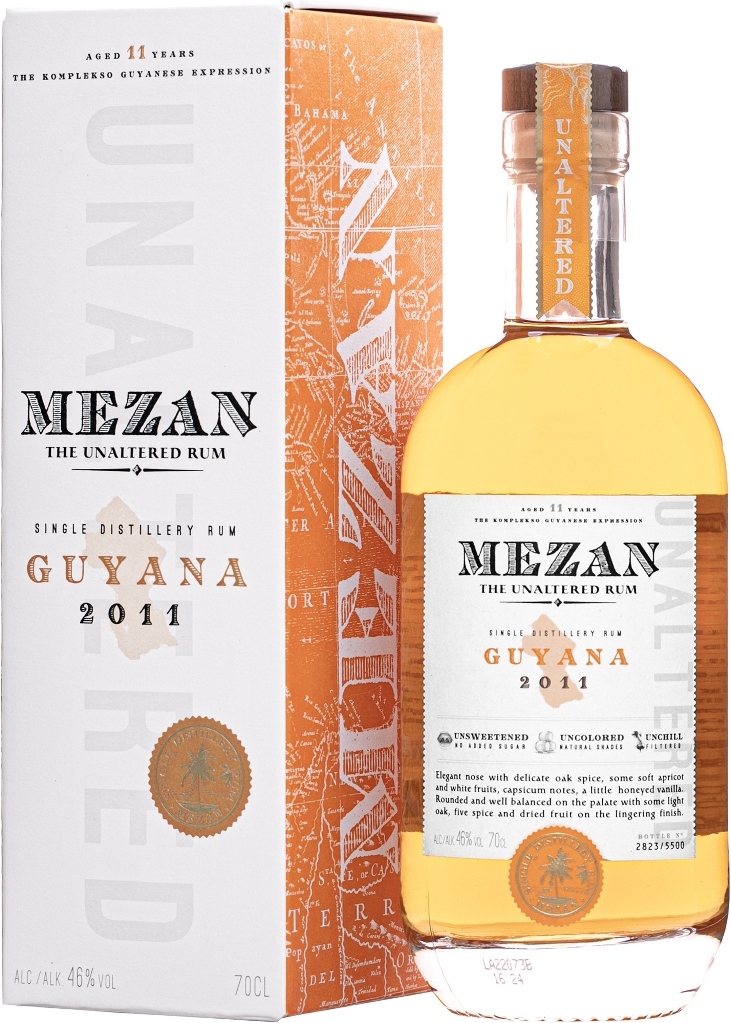 Mezan, Guyana — изысканный винтажный ром, который производится на заводе Diamond Distillery в Гайане. Этот ром был дистиллирован в 2011 году в четырехколонных перегонных кубах Modern French Savalle. Ром выдерживается в бочках из-под бурбона на протяжении не менее 11 лет. Бочки из-под бурбона меньше всего влияют на конечный вкус рома. Выдержка проходит в 2 этапа: первые 3 года ром созревает в жарком и влажном тропическом климате Гайаны, затем транспортируется в Европу и дозревает в условиях местного климата остальные 8 лет. Континентальный климат способствует меньшему окислению и предотвращает чрезмерную концентрацию сложных эфиров. Винтаж 2011 года был разлит в 2022 году под пристальным вниманием мастера погреба при крепости 46% без холодной фильтрации и окрашивания карамелью.