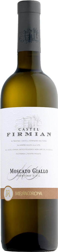 Castel Firmian, Moscato Giallo — прекрасное, ароматное десертное вино, имеющее приятный обволакивающий вкус и сильный, выразительный фруктовый аромат. Его изготавливают из винограда, выращенного в небольшом районе к северу от озера Гарда, где мягкий климат и близость водоема придают ему характер и стиль. Виноград проходит традиционное брожение с предварительной холодной мацерацией и ферментацией при температуре около 16-18 °С. По достижении желаемого уровня сахара процесс брожения останавливается путем охлаждения сусла. Полученное сладкое вино станет отличным компаньоном к пирожным, фруктовым рулетам, штруделю, печенью и сухофруктам.
