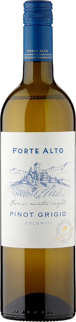 Forte Alto, Pinot Grigio, Dolomiti — элегантное белое полусухое вино, в производстве которого виноделы используют виноград сорта Пино Гриджио, произрастающий на виноградниках с аллювиальными почвами в регионе Доломити. После сбора урожая ягоды подвергают традиционной для белых фин ферментации при низких контролируемых температурах. Потенциал вина составляет 3-4 года.