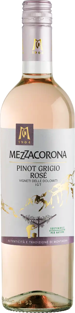 Mezzacorona, Pinot Grigio Rose — свежее, привлекательное розовое вино, изготовленное из винограда сорта Пино Гриджио с отборных виноградников, расположенных в предгорьях долины Адидже, где богатая почва, состоящая из ила и доломитовых пород, обеспечивает превосходное ароматическое созревание винограда и обеспечивает оптимальный уровень кислотности и свежести. Виноград собирается с конца августа по первую неделю сентября. После удаления стеблей и прессования полученное сусло охлаждается до 12°C и остается в контакте с кожицей непосредственно в прессе в течение примерно 8-10 часов, наполняясь красивым розовым цвет и ароматическими компонентами. Затем сусло мягко прессуется при максимум 0,4 бар, чтобы ограничить экстракцию дубильных веществ, после чего фильтруется и ферментируется с добавлением отобранных дрожжей при температуре 16-18°C около 12 дней. Перед розливом по бутылкам вино выдерживается на осадке 3-4 месяца.