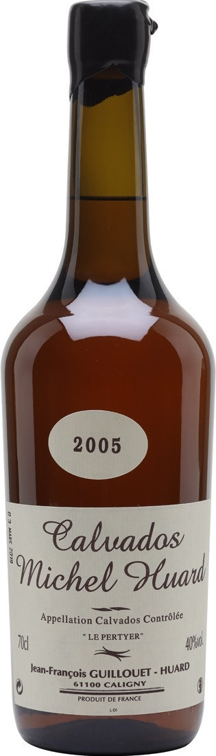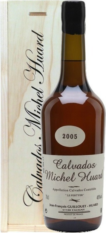 Michel Huard, "Le Pertyer", Calvados, 2005 — пикантный, запоминающийся кальвадос, полученный путем дистилляции яблочного сидра из отборных яблок урожая 2005 года, которые выращиваются в апелласьоне Кальвадос. Для производства кальвадоса рекомендуется использовать 48 сортов яблок, которые разделены по вкусу на следующие критерии: сладкие, сладко-горькие, горькие и кислые. В последнее время молодыми производителями стало считаться более оптимальным соотношение 40% горьких, 40% сладких и 20% кислых яблок для получения высококачественного сидра. Ключевыми критериями в выборе сортов являются содержание танинов в сусле и кислотность.