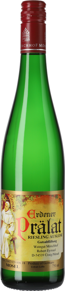Monchhof, Erdener Pralat, Riesling Auslese — белое сладкое вино с захватывающим ароматом и сочным, умеренно сладким вкусом, которое производится из винограда сорта Рислинг позднего сбора, произрастающего на уникальных почвах из голубого сланца. Возраст виноградных лоз превышает100 лет. "Эрденер Прелат" считается лучшим монастырским виноградом, настоящей жемчужиной Мозеля и названо в честь высшего духовного чина аббатства – Прелата. Отборные ягоды Рислинга бережно собирают вручную. После ферментации вино выдерживается в дубовых бочках.