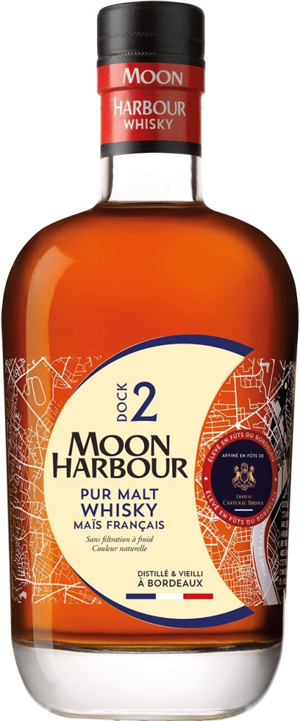 Кукуруза для "Dock 2" Pur Malt Chateau Cantenac Brown поступает из сельских хозяйств Новой Аквитании. От качества исходного сырья на 25% зависит качество будущего виски. После сушки солод измельчают, получается крупа, которую смешивают с кипятком в заторном чане, чтобы превратить крахмал в сахар. Полученное сусло представляет собой полупрозрачную жидкость, ароматную, сладковатую и слегка липкую. Ферментированное сусло называют брагой. Правильно проведенная ферментация — это 25% успеха будущего виски. Для дистилляции компания Moon Harbour использует уникальные медные аламбики, изготовленные вручную семейной компанией Stupfler. Тесный контакт между медью и дистиллятом обеспечивает абсолютно уникальную и удивительную цветочную свежесть. Брага перегоняется только один раз, что позволяет получить исключительный спирт, округлость которого является первоклассной. Далее виски выдерживается 30 месяцев в бочках из-под сладких вин Сотерна в историческом бункере времен Второй Мировой Войны со стенами толщиной около 6 метров, а затем дозревает в только что опустошенных бочках из-под красного вина Гран Крю Шато Кантенак Браун (хозяйство в Марго) в течение 6 месяцев. На этом этапе виски приобретает насыщенный цвет, богатый аромат и мягкий вкус. Срок выдержки и качество используемых бочек — это оставшиеся 50% триумфа готового напитка. Виски разливается без холодной фильтрации и окрашивания карамелью при крепости 45,8%. Виски выпускается в красивой коробке, что делает его отличным подарком для любого торжественного случая.
