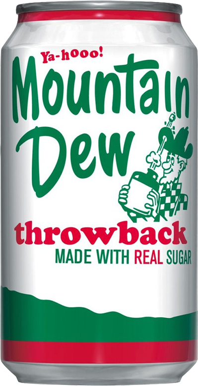 Mountain Dew, Throwback — яркий цитрусовый напиток на основе натурального сахара. Throwback в вольном переводе означает “возвращение к прошлому”, что особенно подчеркивается дизайном в стиле 70-80-х годов. Его название проводит прямую аналогию с первыми американскими содовыми напитками, которые готовились с традиционным сахаром, без искусственных подсластителей. Впервые "Маунтин Дью" Троубэк был выпущен лимитированной партией в апреле-июне 2009, но благодаря популярности у потребителей было налажено его непрерывное производство.
