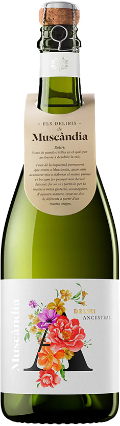 Muscandia, Deliri Ancestral Brut — уникальное белое игристое вино, в купаж которого вошли сорта винограда Мускат Фронтиньян и Совиньон Блан, выращенные на виноградниках компании в Пенедес. Климат региона Пенедес типично средиземноморский: умеренный, теплый и мягкий, с обилием солнечных часов и небольшим количеством осадков, что делает его идеальным регионом для выращивания винограда. Урожай собирается по достижении ягодами оптимальной спелости. Это игристое вино производится старинным методом "Ансентраль", более известным как "дедовский". В отличие от классического метода, который включает 2 этапа брожения, здесь вино бродит всего один раз. Два сорта винограда ферментируются вместе в чанах из нержавеющей стали при строго контролируемой температуре, чтобы сохранить цветочные ароматы. К концу брожения, когда остается немного сахара, часть сусла отделяется и разливается в бутылки, где и завершается брожение. Углекислый газ в закрытых бутылках растворяется в вине, превращая его в натуральное игристое вино. Затем игристое вино выдерживается на осадке в течение 24 месяцев в погребе хозяйства, на глубине 13 метров. В результате получается легкое и ароматное игристое вино с легким осадком, что свидетельствует о его натуральности.