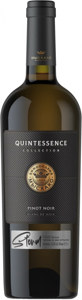 Myskhako, Quintessence, Storm Pinot Noir Blanc de Noir — изысканное белое сухое вино из винограда сорта Пино Нуар, который выращивается в защищенном географическом регионе Кубань. Вино производится в классическом французском стиле Blanc de Noir (белое из черного). Мякоть винограда Пино Нуар светлая, красители почти на 100% находятся в кожуре. Благодаря быстрому и бережному отжиму охлажденных целых гроздей получается легкий виноградный сок и, следовательно, белое вино. В дальнейшем сусло подвергается традиционной для белых вин винификации при контролируемой температуре в стальных чанах. Вино отлично в паре с легкими салатами, морепродуктами, белым мясом. "Квинтэссенция" Шторм Пино Нуар Блан де Нуар выпускается в ограниченном количестве.
